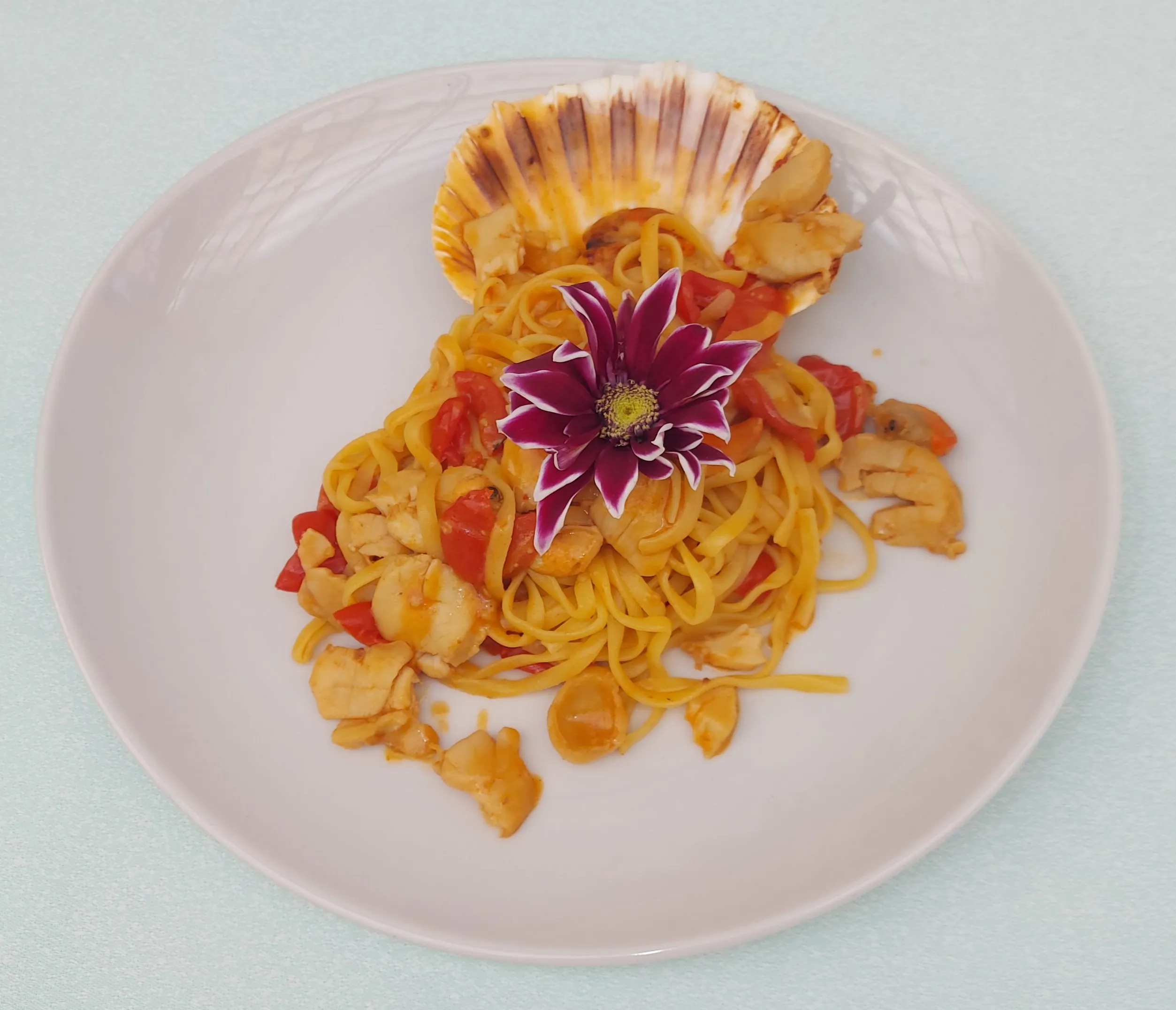 Capesante saltate con pomodoro fresco, poca salsa di pomodoro, olio e aglio. Servite con una capasanta grigliata di guarnizione.