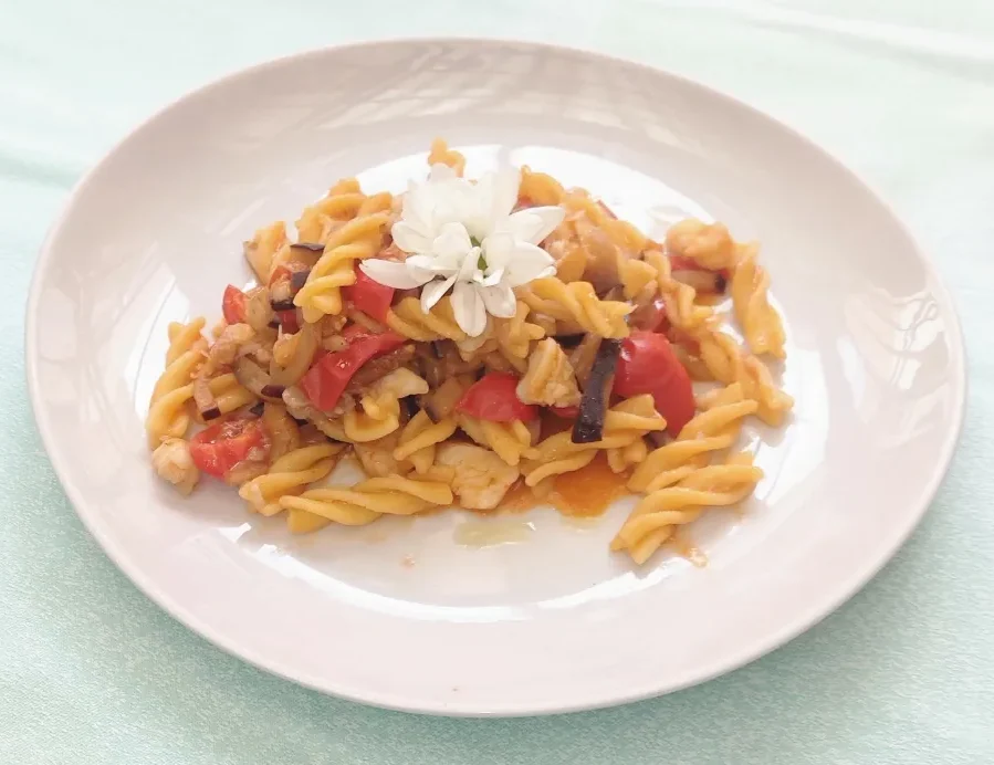 Polpa di pescatrice, melanzane e pomodorini freschi saltati in padella con poca salsa di pomodoro, olio, aglio, peperoncino e sfumati con vino bianco.