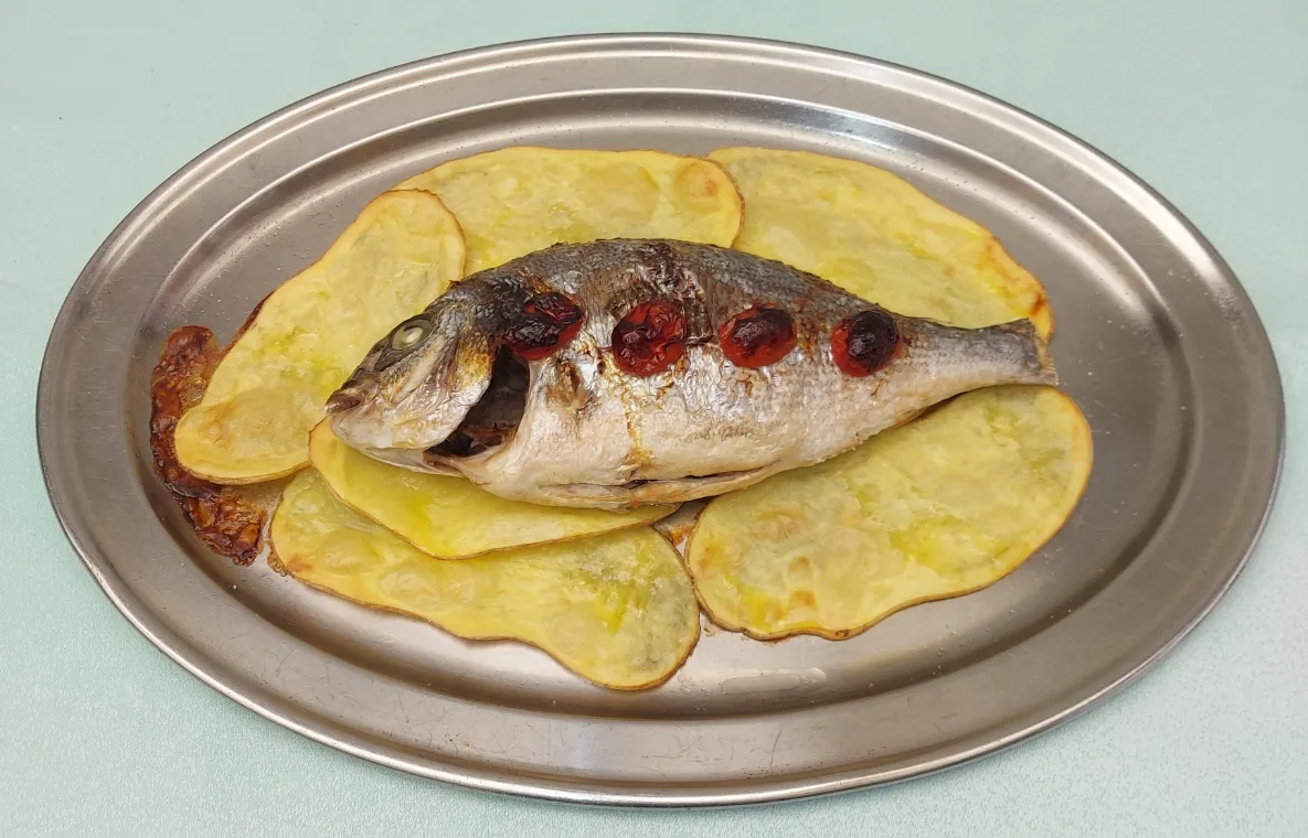 Cotto al forno su un letto di patate tagliate a fettine sottili. I filetti di pesce da noi puliti vengono serviti sulle patate.