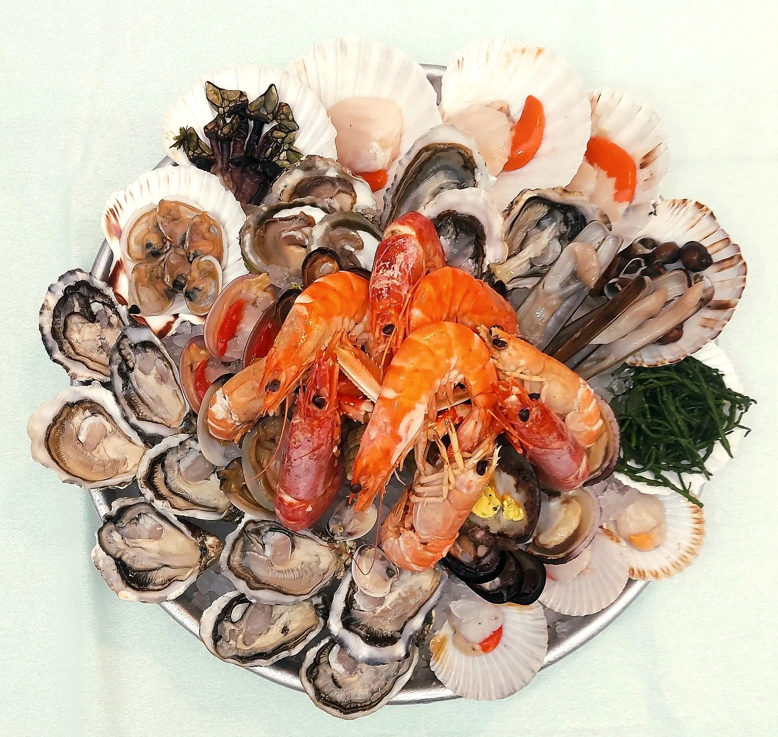 E’ un assortimento di frutti di mare crudi (coquillage) composto indicativamente e secondo disponibilità da: 9 ostriche Gillardeau, 3 ostriche Belon e 3 ostriche Tsarskaya; 3 pezzi di: vongole, cozze, mandorle di mare, cannolicchi, fasolari, mussoli, arselle, cozze pelose, capesante, canestrelli, limoni di mare, ricci e tartufi. Sono inoltre presenti (cotti ma serviti freddi): 3 pezzi di bulli, bulot, mazzancolle tropicali, gamberoni* e scampi; 1 guscio di capasanta con dentro lumachine di mare, 1 con percebes e 1 con lavagnon.