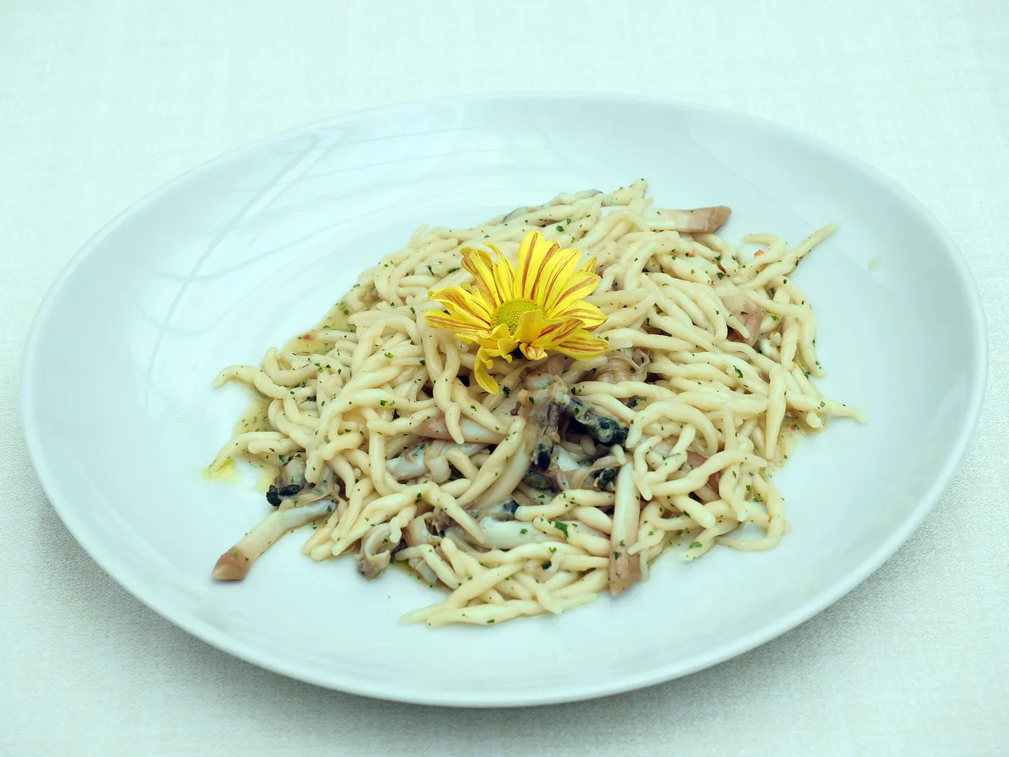 Cannolicchi saltati in padella con olio, aglio e peperoncino, sfumati con vino bianco e saltati con prezzemolo.